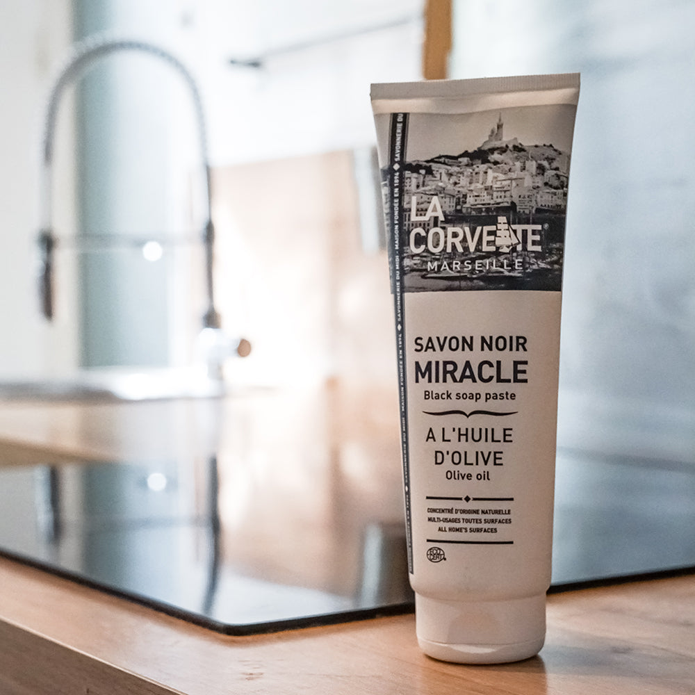 ミラクルに汚れを落とすペーストタイプの住居用石けん。手強い汚れをしっかりと落としながらも、有機オリーブ由来の純石けん分が洗浄面に光沢を与えます。キッチンや換気扇などのしつこい油汚れや、木製家具や革製品などの洗浄&ツヤだしに。ECOCERT認証取得。