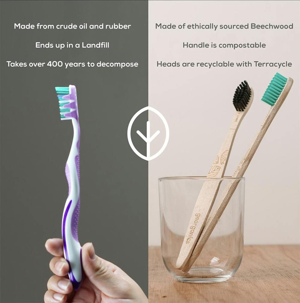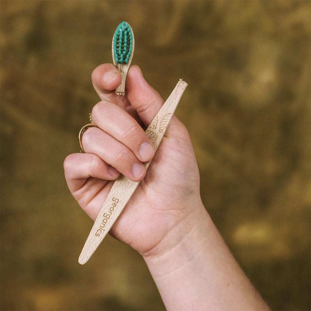 石油で作られたプラスチックやゴム素材の歯ブラシは、最終的には埋立地に行きますが、生分解されるのに400年以上かかると言われています。ジオーガニクスが提供するブナ素材で作られたエシカルな歯ブラシは、ハンドル部分は生分解され、ヘッド部分はテラリサイクルされます。木製の歯ブラシに切り替えるのはいつからでも始められます!