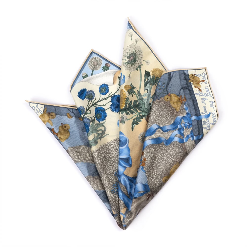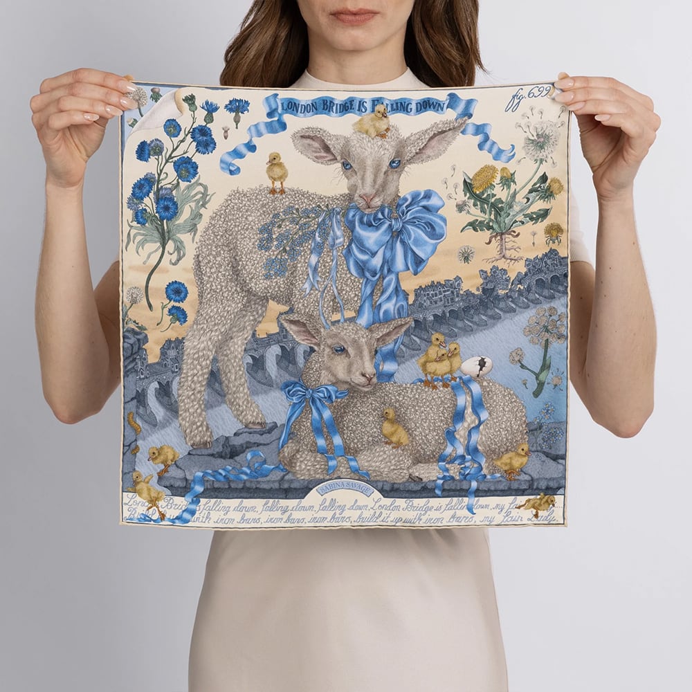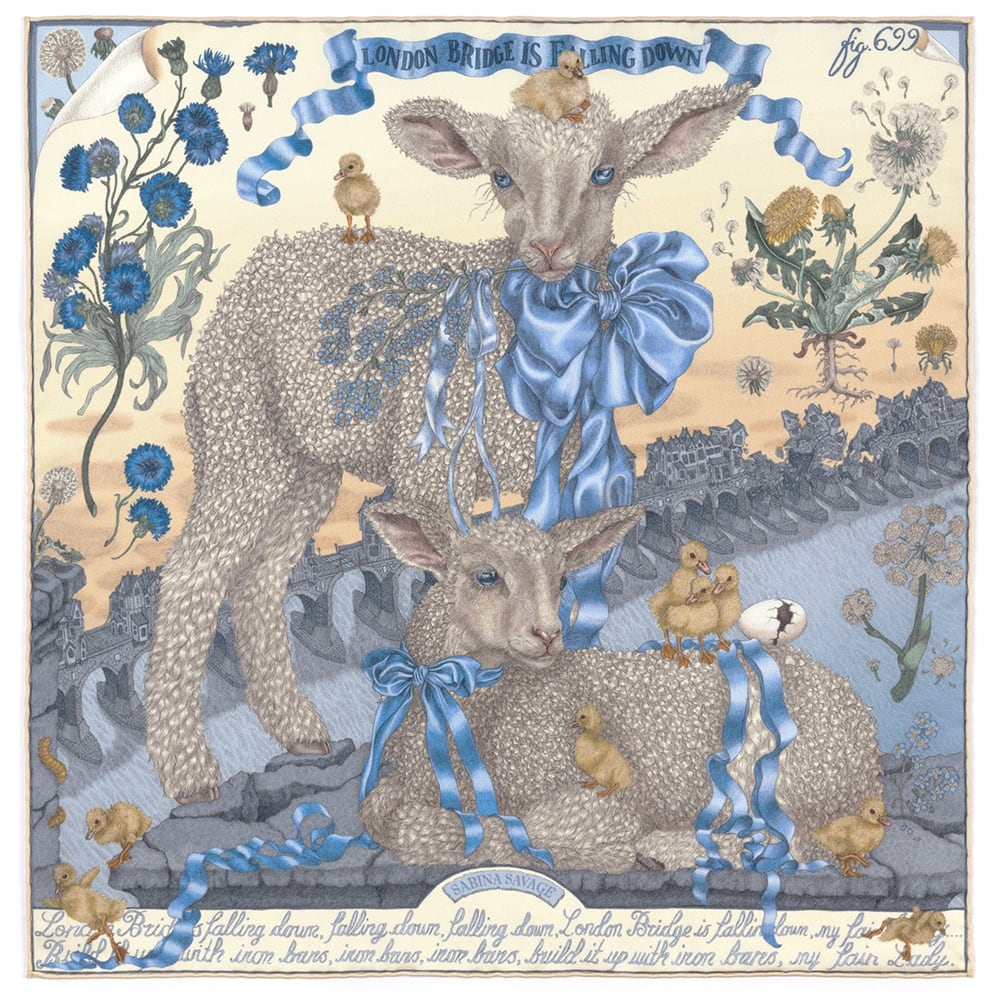 London Bridge is Falling Down(ロンドン橋落ちた):橋の基礎にまつわる噂の暗い真実を秘めた、穏やかで軽快な小唄である。このデザインでサビーナは、ロンドンのフリーメンが毎年羊を走らせてロンドン橋を渡ることを許されているという古くからの伝統(現在も残っている)を利用した。このシーンでは、一対の穏やかな子羊が、崩れかけた石の台座の上でバランスを取り、長いまつげをなびかせ、美しく柔らかく輝くカールをつけている。しかし、台座は今にも崩れ落ちそうで、背後ではオールド・ロンドン・ブリッジがテムズ川に崩れ落ち始めている。孵化したばかりのアヒルの子たちは、危険を冒して下の急流に飛び込もうとしている。災難が迫っているにもかかわらず、視線はまず子羊たちの大きな青い目と、艶やかで豪華なリボンに引き寄せられ、この場面の危険から目をそらす。植物的な野草が夢のような田舎的な感覚を呼び起こし、一匹の子羊が忘れな草の小枝を口にくわえているのが痛々しい。