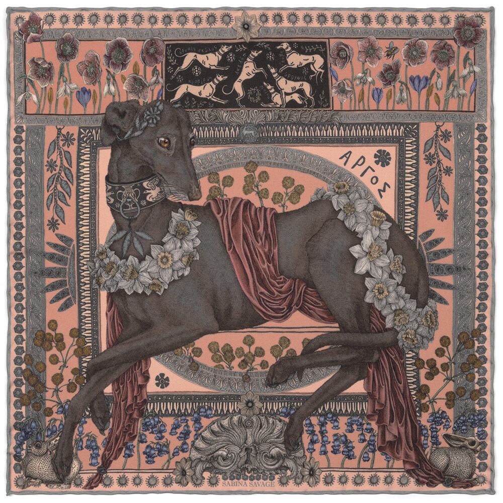 バラ色の指を持つ夜明けが訪れると、琥珀色の目をしたアルゴスは、主人で機知に富んだオデュッセウスのイタキア庭園で、生まれたばかりの子鹿のように静かに横たわり、最後の命令を待っています。そこで、アルゴスはギリシャの伝説の有名な犬を讃えた粘土の銘板の下に横たわり、天のアフロディーテは、光沢のあるドレープ状のヒマティオンと打ち延ばした銀の冠をアルゴスの頭にかぶせます。そして、アルゴスは、神聖な鳥の絵が繊細に描かれた最高級の粘土の首輪を授かり、美しい水仙の花輪をアルゴスの上に置きます。