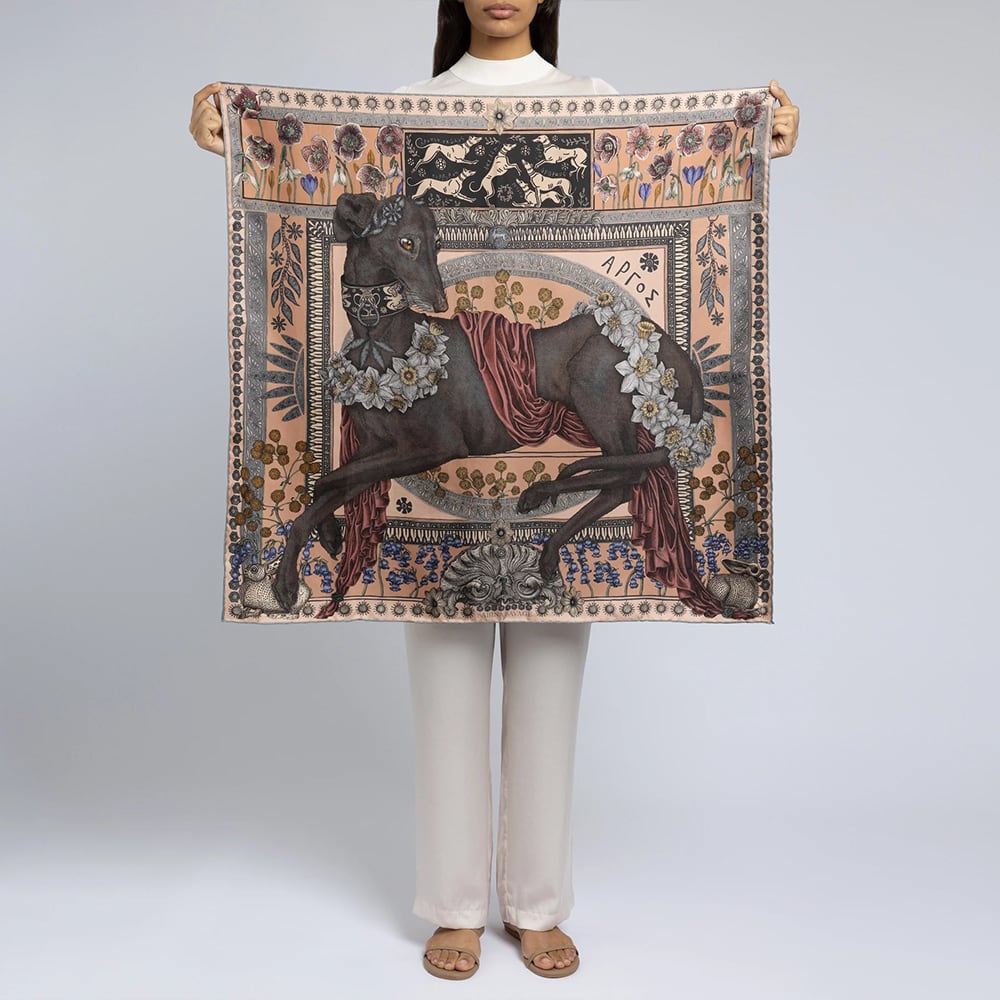 バラ色の指を持つ夜明けが訪れると、琥珀色の目をしたアルゴスは、主人で機知に富んだオデュッセウスのイタキア庭園で、生まれたばかりの子鹿のように静かに横たわり、最後の命令を待っています。そこで、アルゴスはギリシャの伝説の有名な犬を讃えた粘土の銘板の下に横たわり、天のアフロディーテは、光沢のあるドレープ状のヒマティオンと打ち延ばした銀の冠をアルゴスの頭にかぶせます。そして、アルゴスは、神聖な鳥の絵が繊細に描かれた最高級の粘土の首輪を授かり、美しい水仙の花輪をアルゴスの上に置きます。