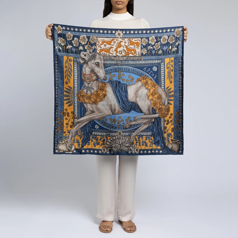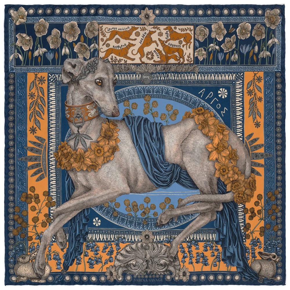 バラ色の指を持つ夜明けが訪れると、琥珀色の目をしたアルゴスは、主人で機知に富んだオデュッセウスのイタキア庭園で、生まれたばかりの子鹿のように静かに横たわり、最後の命令を待っています。そこで、アルゴスはギリシャの伝説の有名な犬を讃えた粘土の銘板の下に横たわり、天のアフロディーテは、光沢のあるドレープ状のヒマティオンと打ち延ばした銀の冠をアルゴスの頭にかぶせます。そして、アルゴスは、神聖な鳥の絵が繊細に描かれた最高級の粘土の首輪を授かり、美しい水仙の花輪をアルゴスの上に置きます。