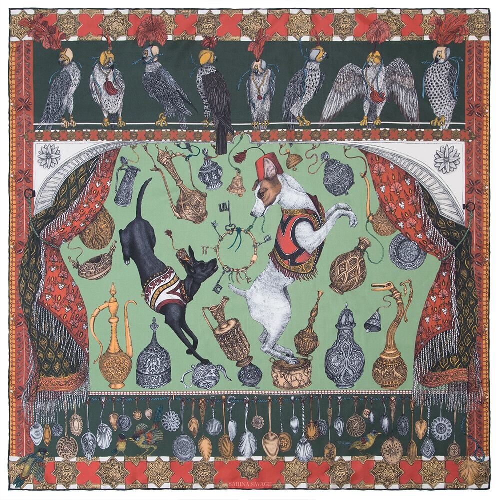 このデザインは、サビーナ自身の飼い犬2匹がアンティークの壺の上でバランスを取りながら鍵の束を盗む様子を描いています。周囲にはフード付きの鷹、刺繍のカーテン、ペルシャのスプーンが配されています。