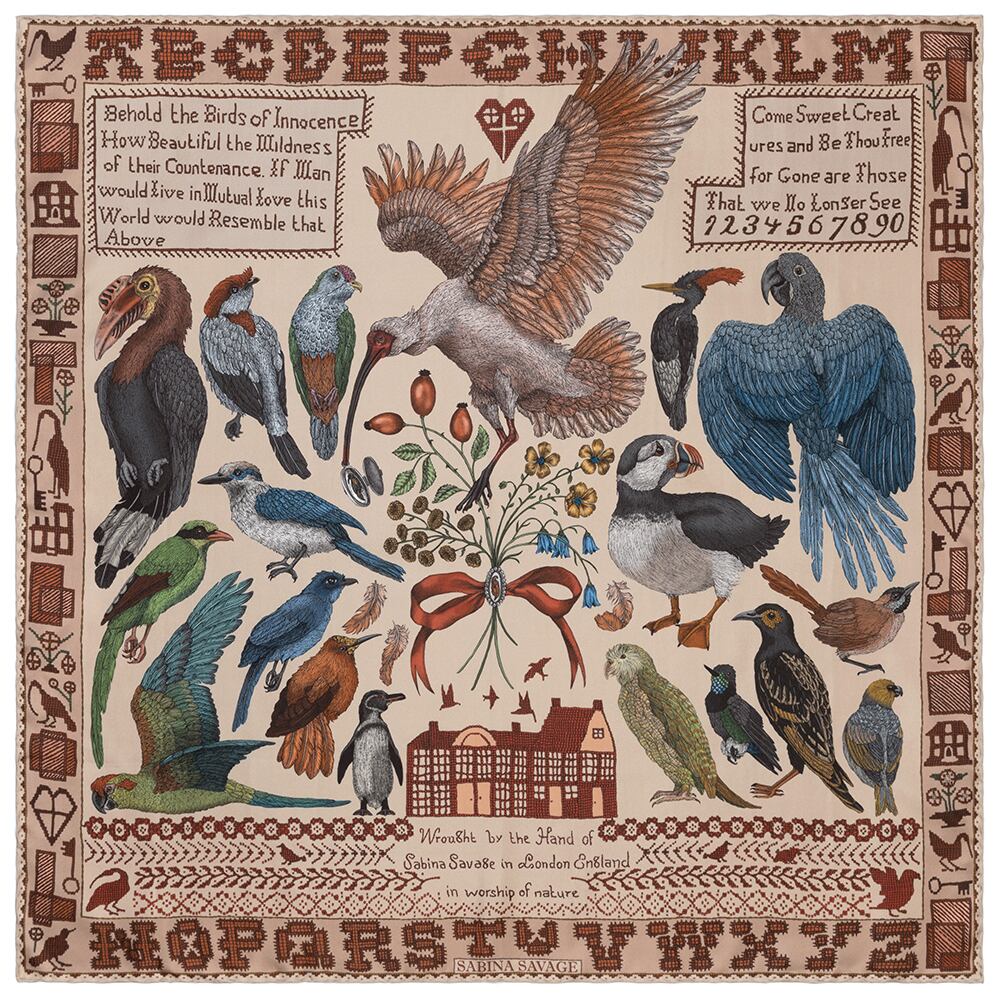 このデザインはアンティークの刺繍見本帳を基にしています。世界中の野鳥を題材としており、いずれも絶滅危惧種または絶滅の恐れがある種とされています。鳥たちを取り囲むように、詩やその他の細部が刺繍風の素朴なイラストで描かれています。デザイン全体は、アルファベットの文字とダーニングのサンプルをあしらった模造刺繍の縁取りで囲まれています。