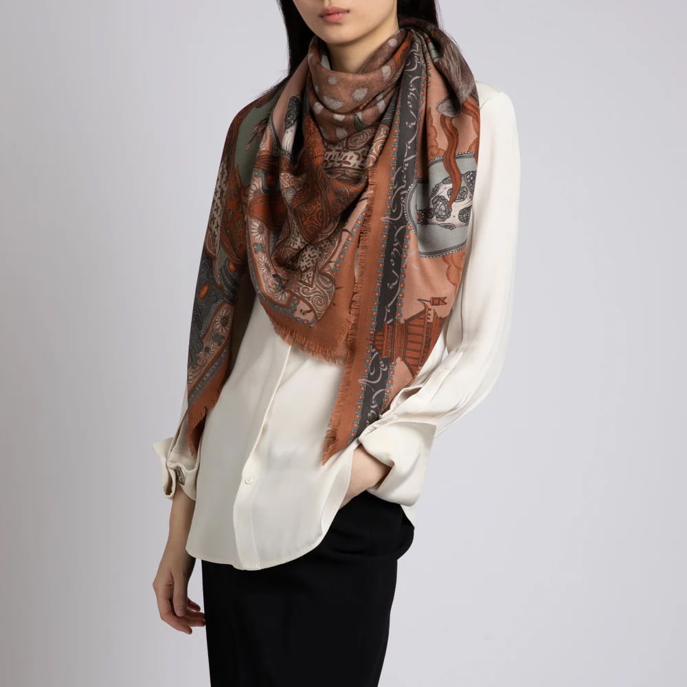 素材は70%ウールと30%シルクで、上品な光沢感と柔らかな風合いが特徴。大判のサイズ(135cm x 135cm)なので、様々な巻き方が楽しめます。さまざまなシーンで活躍してくれるサビーナ・サベージのスカーフで、あなたのおしゃれを一段と引き立てましょう。