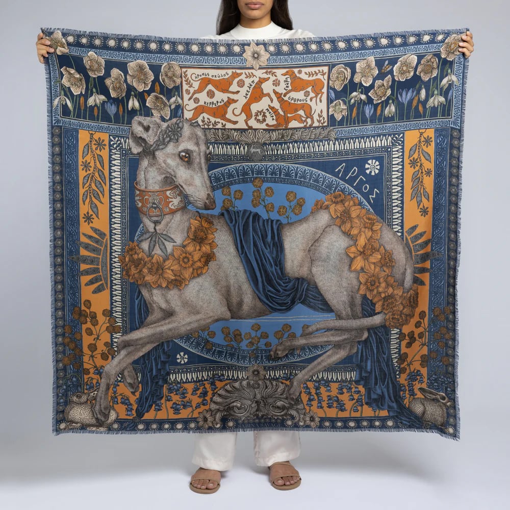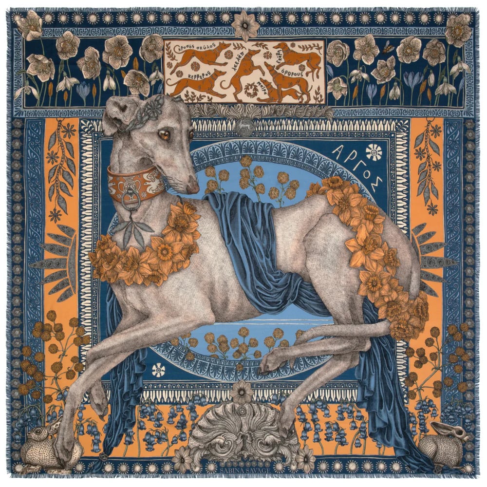 バラ色の指を持つ夜明けが訪れると、琥珀色の目をしたアルゴスは、主人で機知に富んだオデュッセウスのイタキア庭園で、生まれたばかりの子鹿のように静かに横たわり、最後の命令を待っています。そこで、アルゴスはギリシャの伝説の有名な犬を讃えた粘土の銘板の下に横たわり、天のアフロディーテは、光沢のあるドレープ状のヒマティオンと打ち延ばした銀の冠をアルゴスの頭にかぶせます。そして、アルゴスは、神聖な鳥の絵が繊細に描かれた最高級の粘土の首輪を授かり、美しい水仙の花輪をアルゴスの上に置きます。